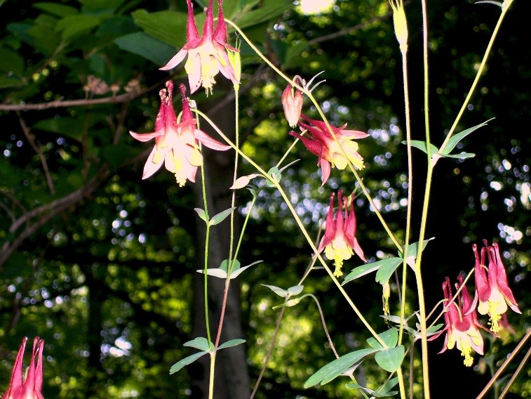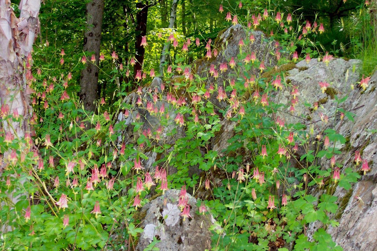 Aquilegia canadensis, or red columbine, is a native herbaceous perennial plant that grows in both sun and shade on rocky outcrops. The plant can grow from six to 30 inches tall with flowers one – two inches long with yellow petals. These flowers are very popular with butterflies and hummingbirds.