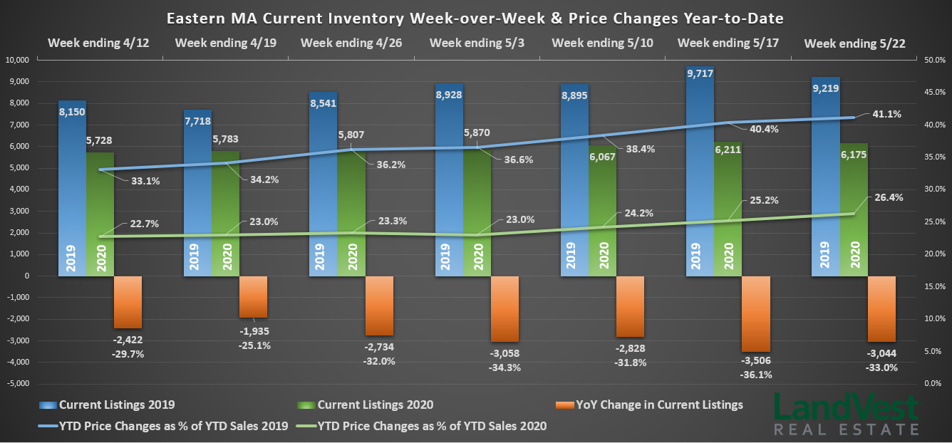 For the seven counties that make up Eastern Massachusetts, the story is one that began with a housing shortage before the pandemic hit. For the last seven weeks, available inventory has ranged from -25% to -36% below the 2019 inventory levels for the same period. Another indicator of the current seller market is the low percentage of price changes relative to total sales year-over-year. As of May 22, 2019, 41% of year-to-date sales had price changes, whereas in 2020 only 26% of year-to-date sales had price changes. The bottom line: sellers aren’t budging on prices, not with more buyers than available houses.