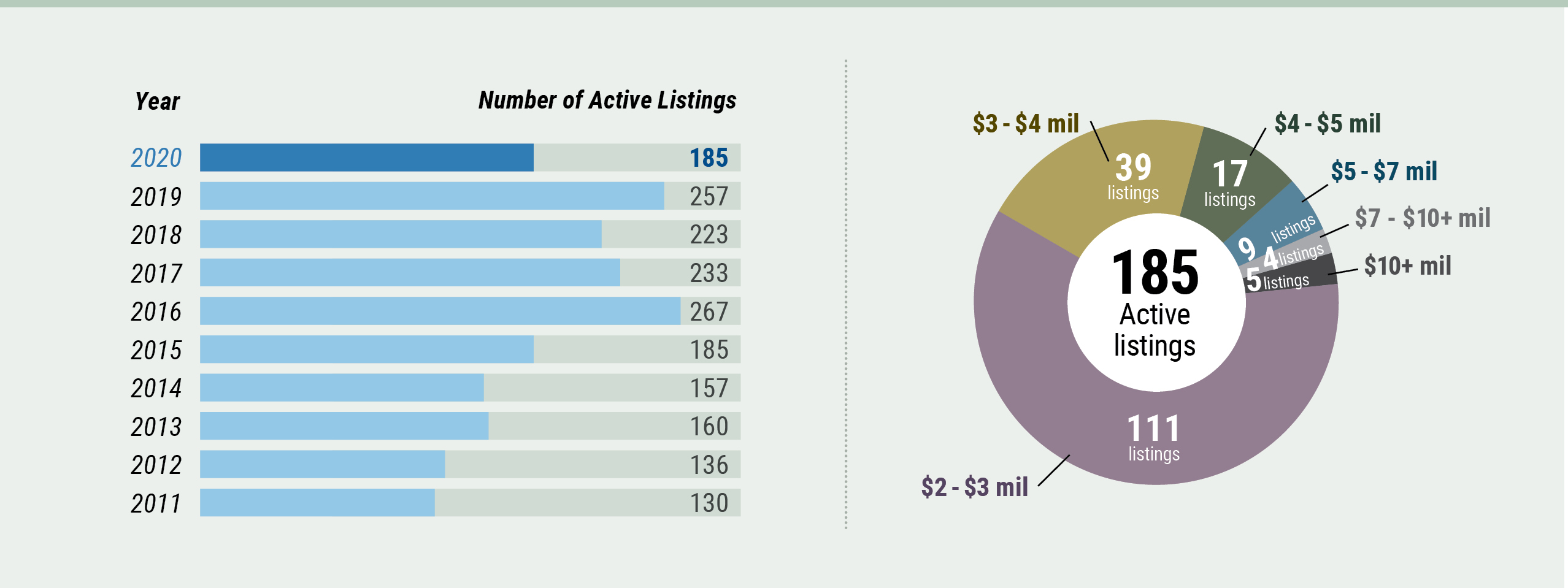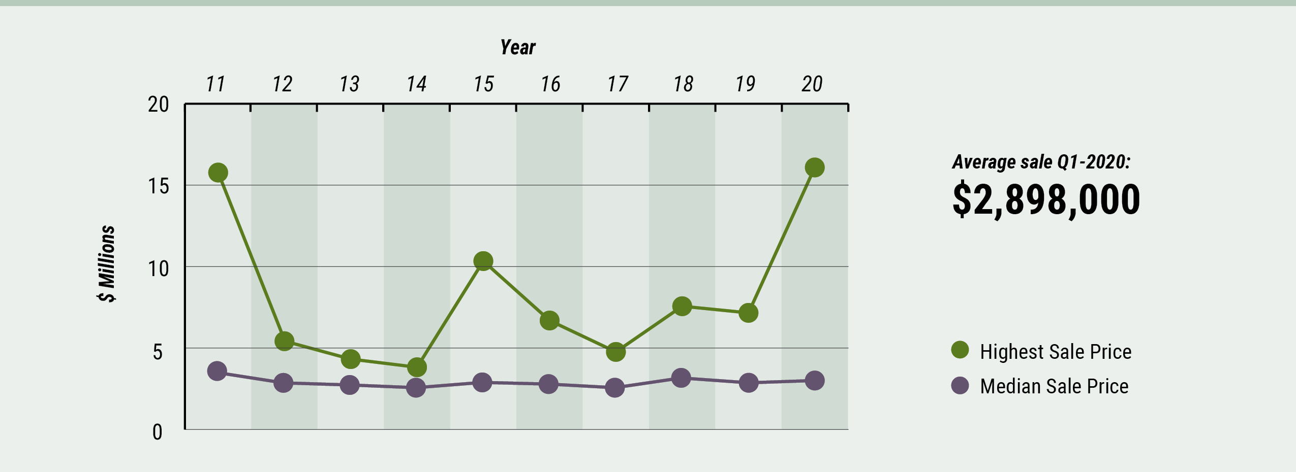 Sales in the first quarter of 2020 increased by 17% to a record 54 compared to a record 46 last year and a record 44 in 2018. Since 2010 there have been, on average, 32 sales at the end of the first quarter. The vast majority (72%) of these sales were in the $2-$3 million range. Three sales were above $5,000,000. In the first three weeks of Q2, it appears that there has been a slow down with 12 high-end sales compared to 18 in the same time period last year.