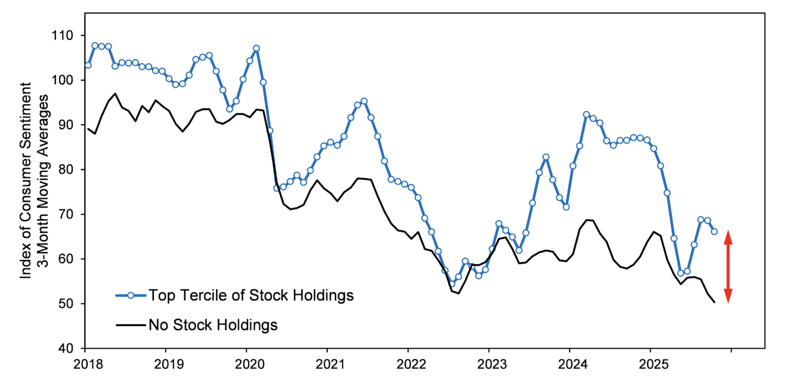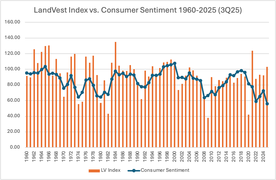 First, let’s check in on the LandVest Economic Index, which tracks the gap between how the economy is performing and how consumers feel about it. In the second quarter of 2025, the index was relatively balanced at +6.5. This meant that the economy was 6.5 points better than consumers felt about it. By the end of the third quarter, however, the delta was +47.0, meaning that the economy was 47 points better than the consumer’s perception of it. That is the second largest gap observed in the last 65 years. The only higher reading came in 2021 when the economy was beginning to exit the COVID pandemic. In other words, Americans once again feel bad about a great economy.