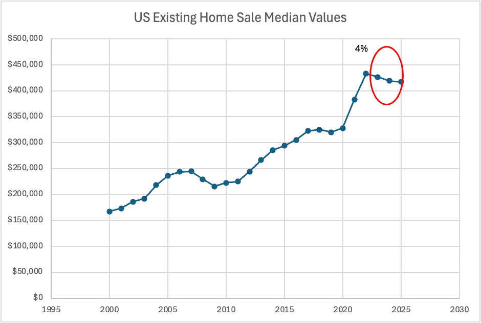 The housing market has been in correction since 2022; we just don’t want to admit it. Median home values are off 4% since the peak, yet the correction appears to be focused in the retail market, versus the luxury segment which continues to set new records.